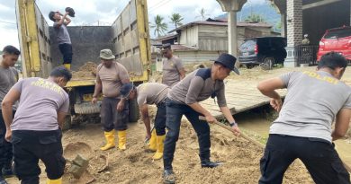 Tribratanewsacehselatan – Polres Aceh Selatan Polda Aceh melaksanakan kegiatan bakti sosial berupa pembersihan sisa-sisa material banjir bandang di Desa Ladang