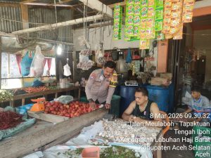 Tribratanewsacehselatan – Dalam rangka menjaga situasi keamanan dan ketertiban masyarakat (kamtibmas) tetap kondusif selama bulan suci Ramadhan, Bhabinkamtibmas Polsek Labuhanhaji Barat Polres Aceh Selatan Polda Aceh melaksanakan kegiatan sambang kepada para pedagang sayur di wilayah Kecamatan Labuhanhaji Barat, Minggu, 8 Maret 2026.