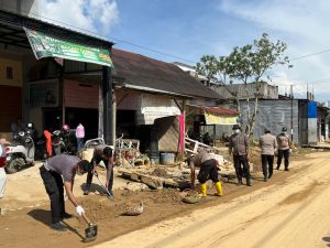 Tribratanewsacehselatan – Sebagai bentuk kepedulian dan tanggung jawab sosial terhadap masyarakat terdampak bencana, puluhan personel Polres Aceh Selatan Polda Aceh dikerahkan ke wilayah Kecamatan Trumon untuk melaksanakan gotong royong pembersihan material pasca banjir yang terjadi sehari sebelumnya. Kegiatan ini dilakukan guna mempercepat pemulihan lingkungan serta mendukung aktivitas masyarakat agar kembali normal, Jumat, 26 Desember 2025.