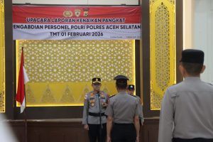 Tribratanewsacehselatan – Polres Aceh Selatan Polda Aceh menggelar Upacara Laporan Kenaikan Pangkat Pengabdian bagi personel Polri di lingkungan Polres Aceh Selatan yang berlangsung di Aula Bharadaksa Polres Aceh Selatan. Kegiatan tersebut berlangsung dengan khidmat dan penuh rasa kebanggaan sebagai bentuk penghargaan institusi kepada personel yang telah menunjukkan dedikasi dan pengabdian selama bertugas, Selasa, 10 Maret 2026.