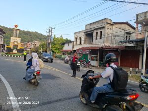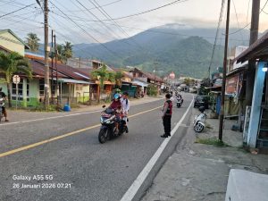 Tribratanewsacehselatan – Sat Samapta Polres Aceh Selatan Polda Aceh melaksanakan kegiatan strong point pagi hari di sejumlah titik rawan dan persimpangan jalan utama pada jam sibuk pagi. Kegiatan ini bertujuan untuk memberikan rasa aman dan nyaman kepada masyarakat yang memulai aktivitas, khususnya saat arus lalu lintas meningkat, Senin, 26 Januari 2026.