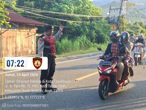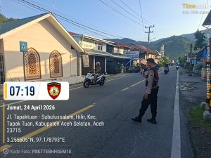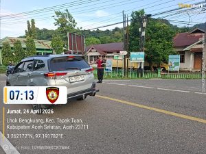 Tribratanewsacehselatan – Dalam rangka memberikan pelayanan optimal kepada masyarakat, Satuan Samapta Polres Aceh Selatan Polda Aceh secara konsisten melaksanakan kegiatan strong point pada jam sibuk pagi hari. Kegiatan ini menjadi salah satu langkah strategis kepolisian dalam menjaga kelancaran arus lalu lintas serta menciptakan rasa aman bagi masyarakat yang memulai aktivitas di pagi hari, Jumat, 24 April 2026.