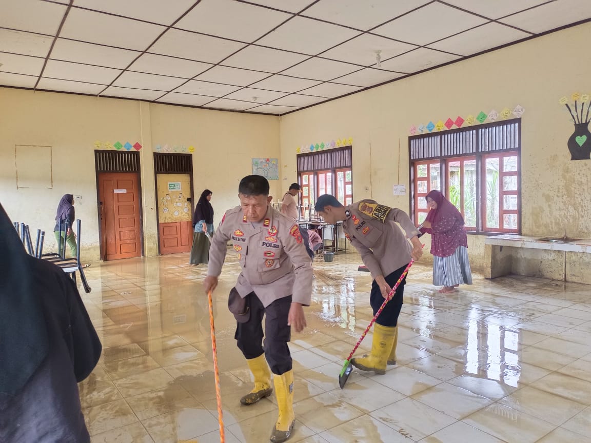 Polsek Trumon Timur Gelar Gotong Royong Bersama Warga dan Perangkat Desa Bersihkan SMPN 4 Trumon Timur Pasca Banjir
