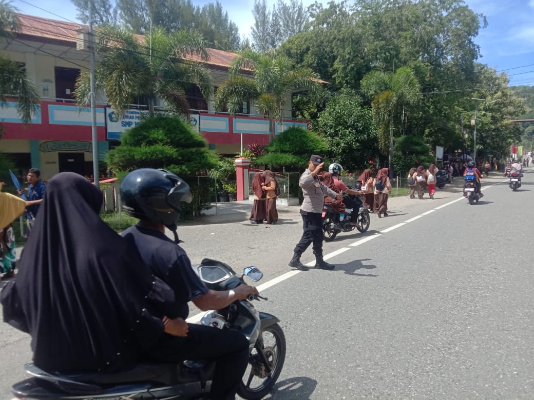 Tribratanewsacehselatan – Polsek Tapaktuan Polres Aceh Selatan Polda Aceh melaksanakan kegiatan pengaturan lalu lintas (gatur lalin) jam pulang sekolah di