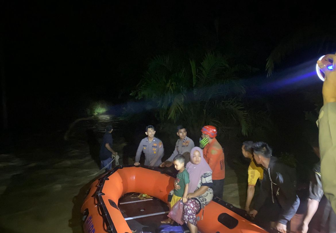 Tribratanewsacehselatan – Polsek Trumon Timur bersama personel Brimob, TNI, BPBD dan Tim SAR melakukan evakuasi korban banjir dari Dusun Perkebunan